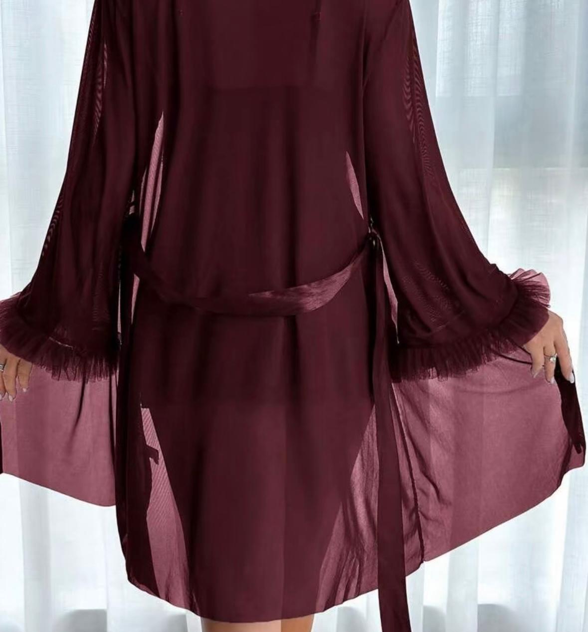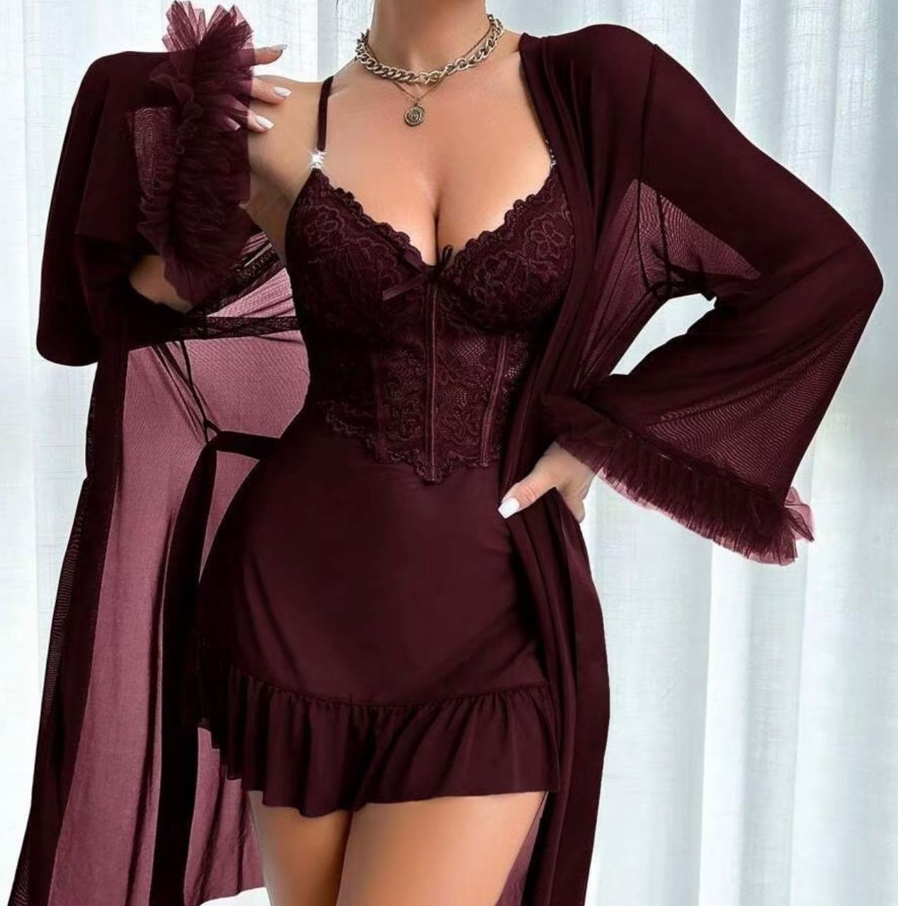 Elegant Maroon 2‑Piece Lace Cami Nightgown & Mesh Robe Set – Fishbone Waist Cinch & Dramatic Wide Sleeves  Sexy Maroon Lace Cami Nightdress + Wide‑Sleeve Fishbone Robe Set – Satin Bow Detail, Semi‑Sheer Elegance