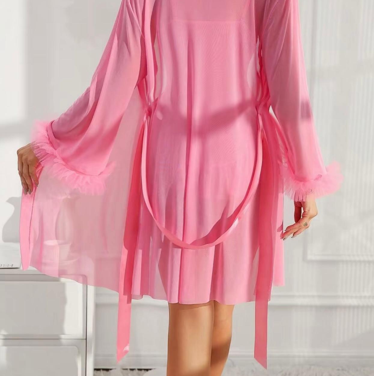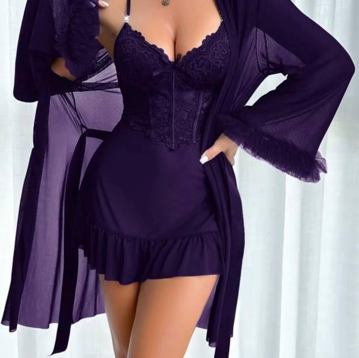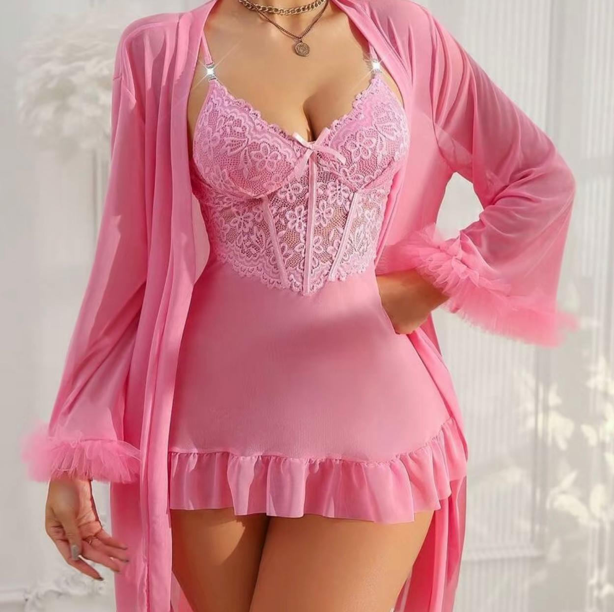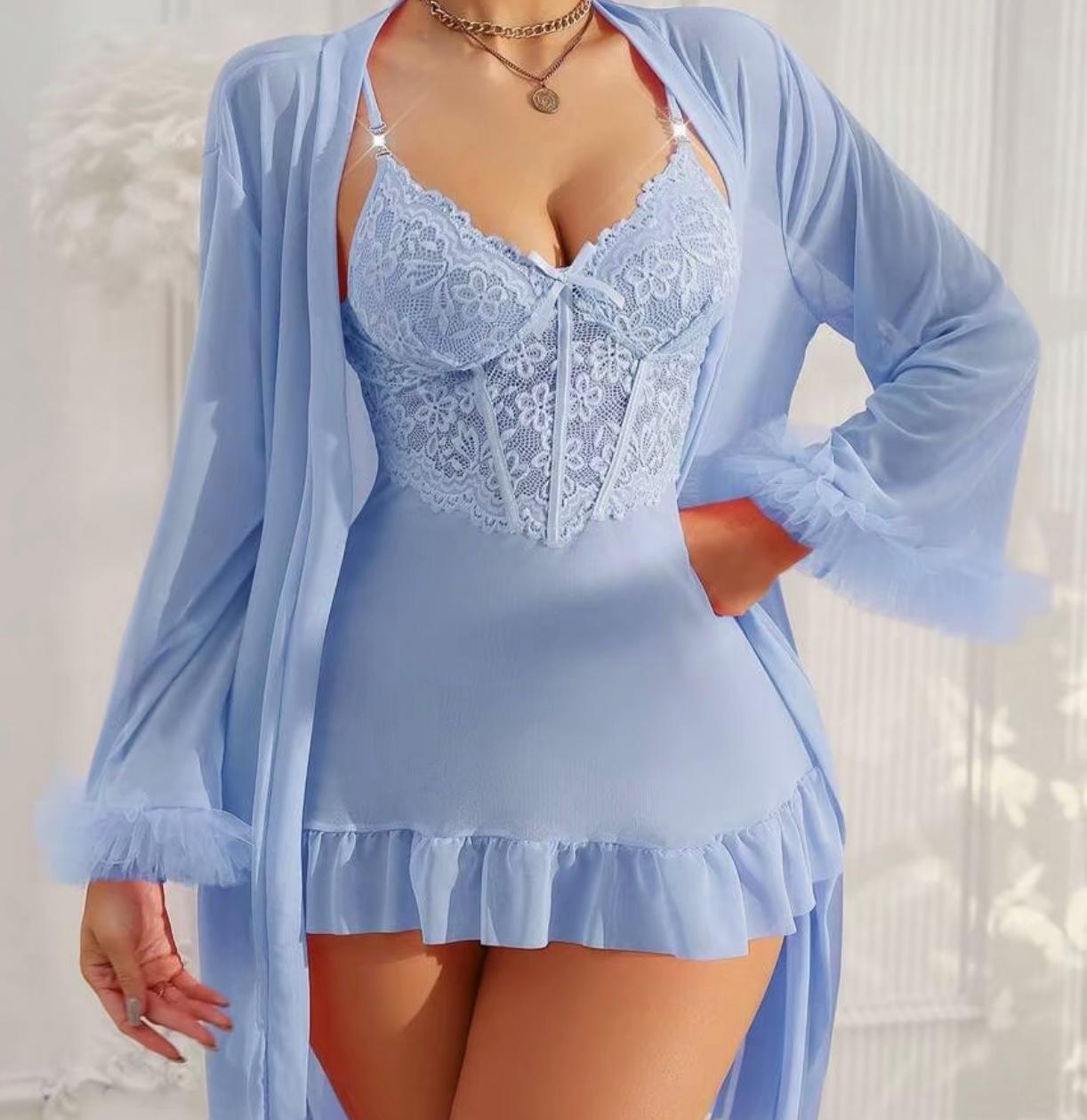 This stunning 2-piece nightwear set includes a delicate lace cami nightgown with a cinched “fishbone”-style waist paired with a thigh-length mesh robe featuring dramatic wide sleeves Amazon+8SHEIN+8TikTok+8TikTok+2HIGH STREET PAKISTAN+2onehub.pk+2.