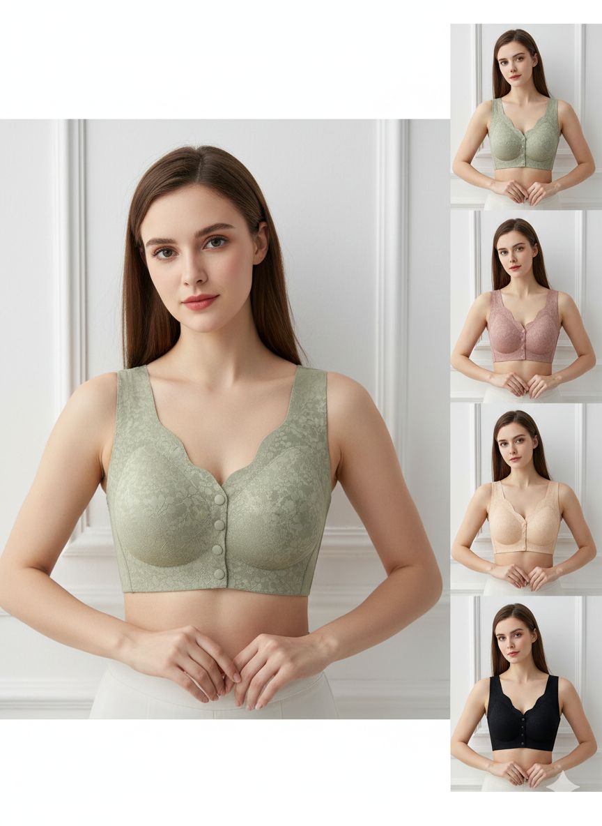 Discover the perfect blend of elegance and comfort with this front-button lace bra. Designed with soft, breathable fabric and a delicate floral lace pattern, it offers gentle support and a flattering natural shape. The front button closure makes it easy to wear, while the wide shoulder straps and smooth underband provide all-day comfort without pressure or digging. Lightly contoured cups ensure a seamless look under clothing. Available in multiple beautiful colors to suit your style, this bra is ideal for daily wear, lounging, or special occasions.